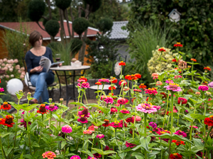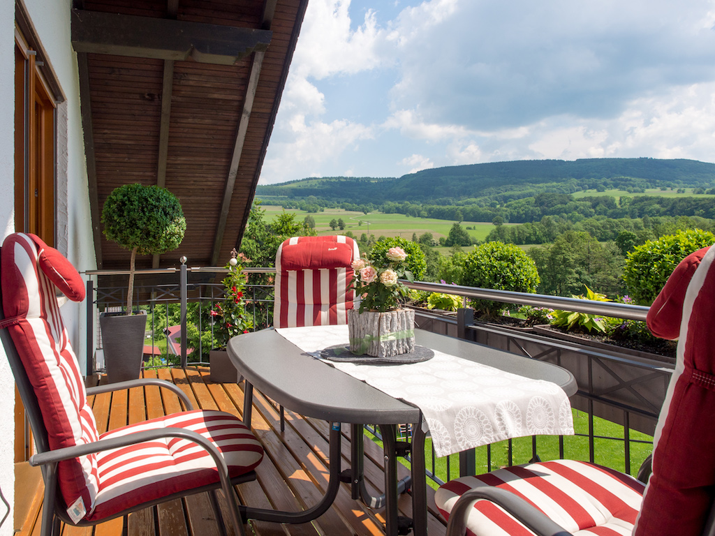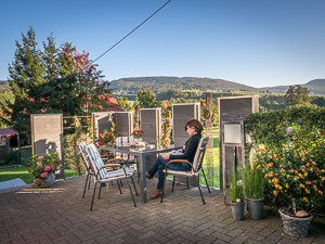 Unsere 4 Sterne Wohnung ist mit 65m² zwar etwas kleiner, bietet aber auch ausreichend Platz und ist ebenfalls sehr geschmackvoll, modern und hochwertig eingerichtet. Der große Wohnraum mit gemütlichem Ecksofa, Essplatz und Küchenecke verbindet das Angenehme mit dem Nützlichen und hat dabei einige besondere Highlights zu bieten: neben der komfortablen Fußbodenheizung sorgt ein Kaminofen für wohlige Wärme und erzeugt geichzeitig ein romantisches Flair. Ein großes Glaselement im Wohnraum bietet Ihnen eine herrliche Aussicht auf die schönen Rhönberge und verschafft Ihnen direkten Zugang zur überdachten Terrasse mit gemütlicher Sitzgruppe sowie zur Spiel- und Liegewiese - besonders toll für Familien mit Kindern.